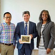 Three proud alumni presented a check for $22,000 to WSSU’s College of Business and Entrepreneurship for its Financial Planning Program.