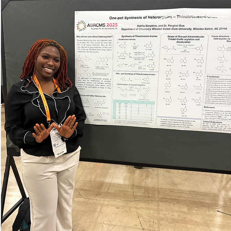 Simpkins said her research journey began when her instructors recognized her potential. “In my opinion, my success at WSSU started when Dr. Mamudu Yakubu recognized my talents and recommended me to do research under Dr. (Fenghai) Guo,” she said. “He has been the largest factor in my success as he sent me to multiple conferences and gave me the confidence and education to succeed at these conferences and even in my classes. As my boss, advisor and professor for Organic Chemistry I, he has been by my side throughout my transformative journey at WSSU.”